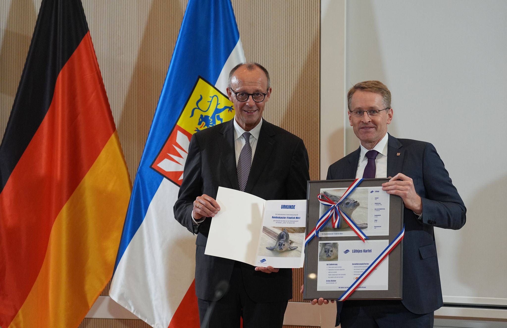 Husum (dpa/lno) – Draußen brüllen Demonstranten «Wir sind das Stadtbild», drinnen gibt es für den Kanzler ein Geschenk der Landesregierung. Friedrich Merz (CDU) hat am Montag Schleswig-Holstein besucht und sich im Rathaus von Husum mehr als eine Stunde lang mit dem Kabinett von Ministerpräsident Daniel Günther (beide CDU) ausgetauscht. Von Günther erhielt der Kanzler eine Patenschaftsurkunde für den Seehund... Mehr lesenKanzler Friedrich Merz (links, CDU) hat Schleswig-Holstein besucht und Ministerpräsident Daniel Günther (CDU) getroffen. Marcus Brandt/dpa