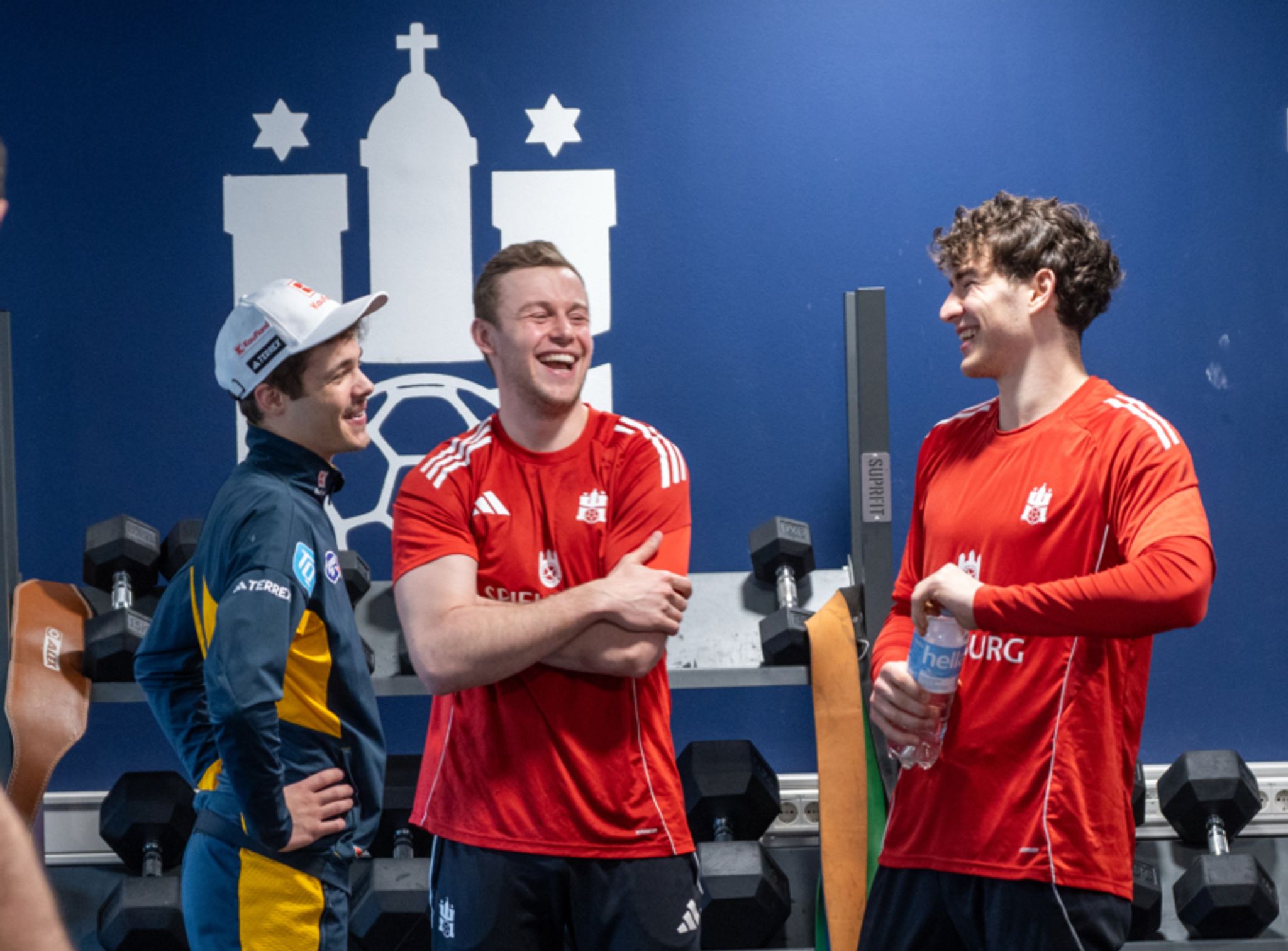 Hamburg (dpa/lno) – Ungewöhnlicher Trainingsbesuch bei den Bundesliga-Handballern des HSV Hamburg: Während eines Besuchs in der Hansestadt schaute Skisprung-Olympiasieger Philipp Raimund beim Team von Trainer Torsten Jansen vorbei. Der Goldmedaillen-Gewinner von der Normalschanze gönnte sich nicht nur einen Kaffee, sondern trat auch bei einem Sprungwettbewerb gegen die Handballer an. Beim sogenannten Counter Movement Jump, einem Sprung aus der Kniebeuge... Mehr lesenSkispringer-Olympiasieger Philipp Raimund (l-r) unterhält sich mit den Hamburger Handballern Moritz Sauter und Elias Kofler. Lea Düffert/HSVH/dpa