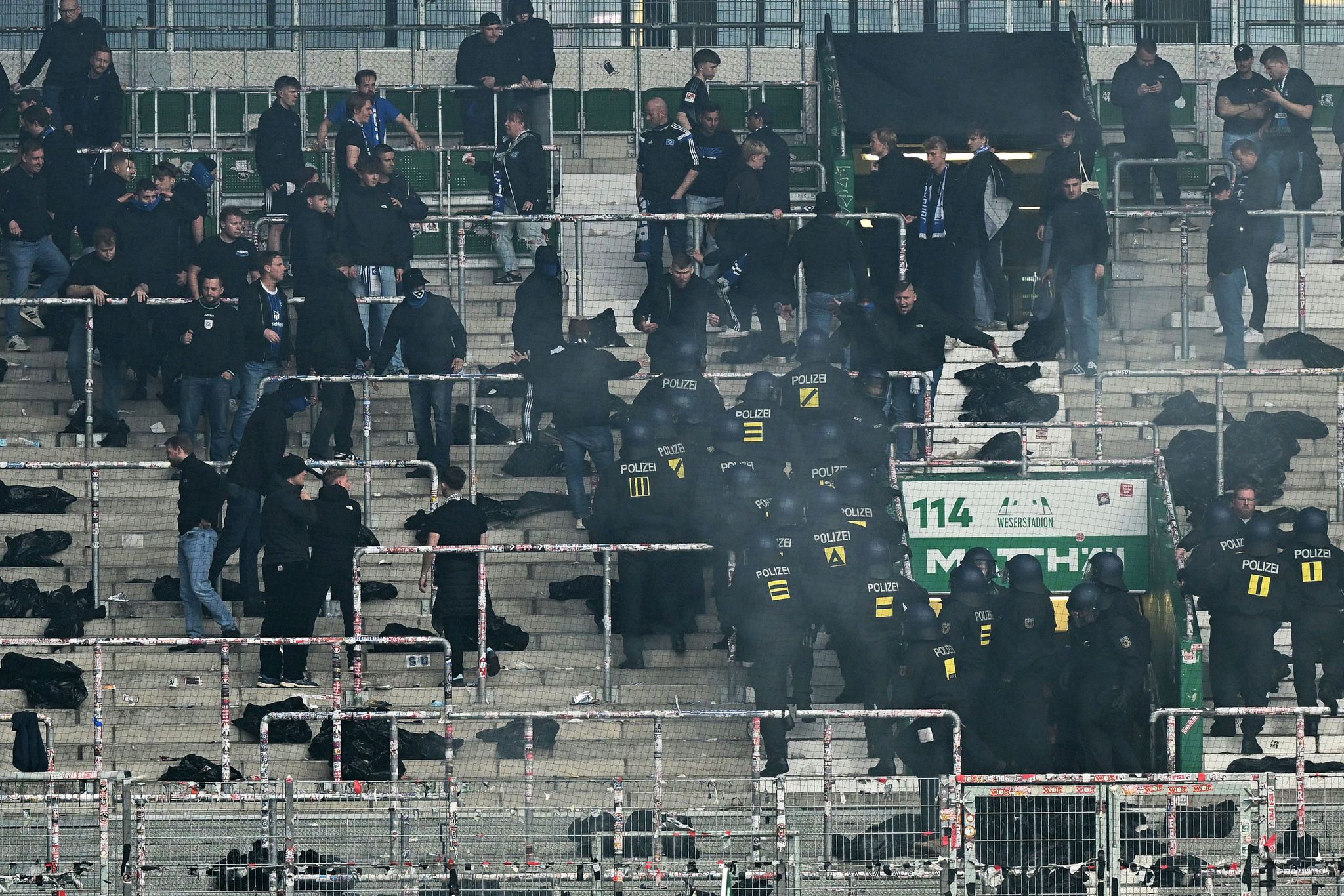 Bremen (dpa) – Wegen Leuchtraketen aus dem HSV-Fanblock wäre das Bundesliga-Nordderby zwischen Werder Bremen und dem Hamburger SV nach dem Schlusspfiff beinahe eskaliert. Es kam sogar zu einem Polizei-Einsatz im Gästebereich des Weserstadions. Als der 3:1-Sieg der Bremer feststand, warfen Hamburger Anhänger zunächst kleinere Leuchtfeuer in den benachbarten Tribünenblock mit Bremer Zuschauern. Anschließend schossen sie Leuchtraketen mit einer so... Mehr lesenPolizei-Einsatz im Gästeblock nach dem Nordderby zwischen Werder Bremen und dem Hamburger SV. Carmen Jaspersen/dpa